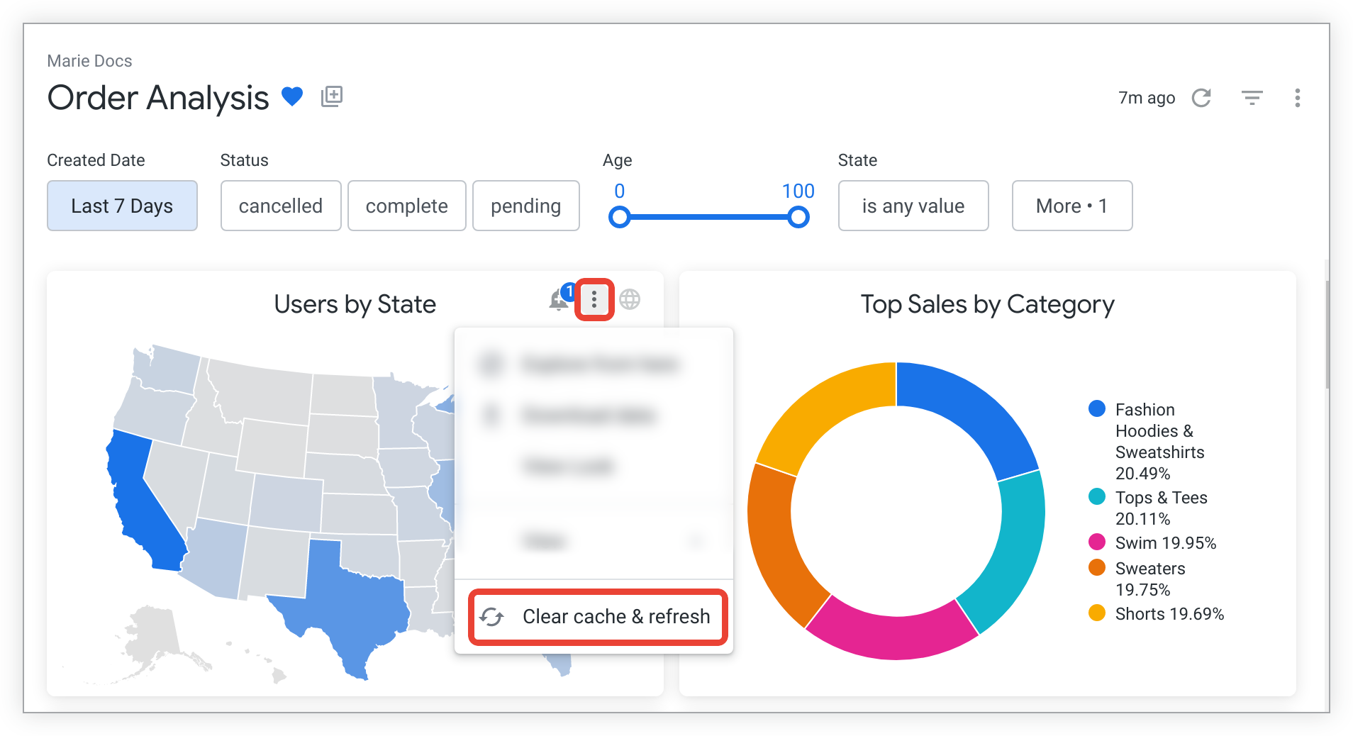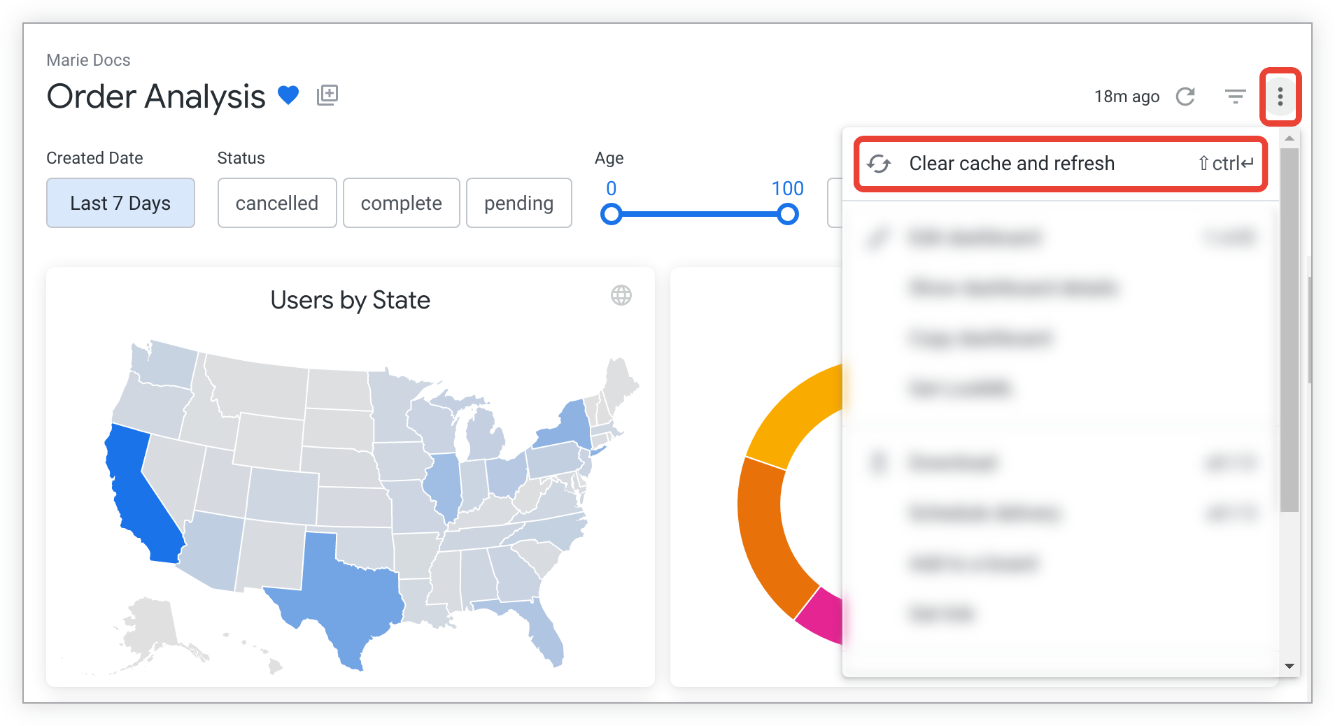 2. Select Clear cache and refresh from the three-dot menu in the upper right of the dashboard. This method refreshes the data for all tiles on the dashboard from the database and resets the data cached for the dashboard.