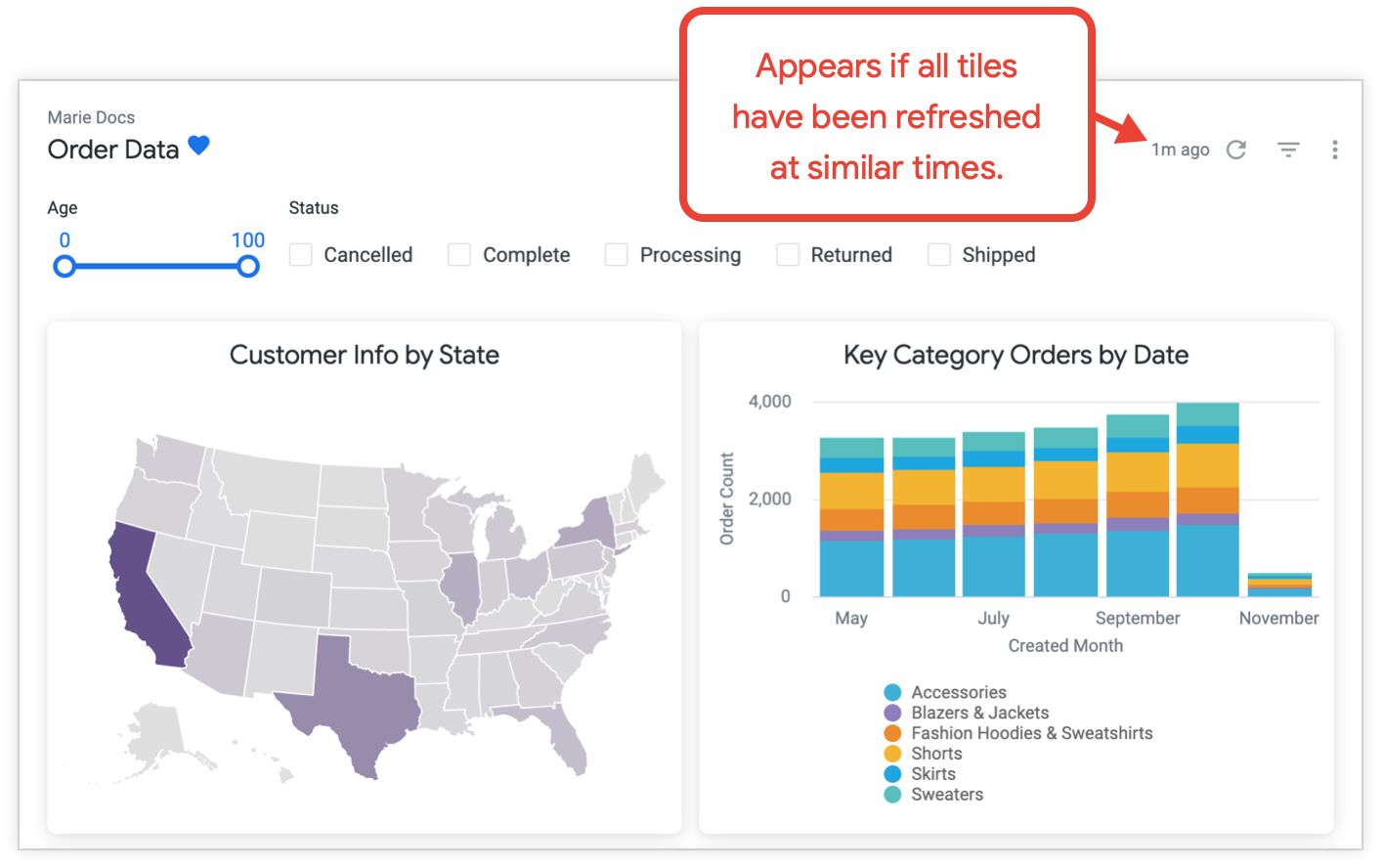 If the data for all tiles on the dashboard has been refreshed from the database at roughly the same time, the top right of your dashboard shows how recently the data was updated.