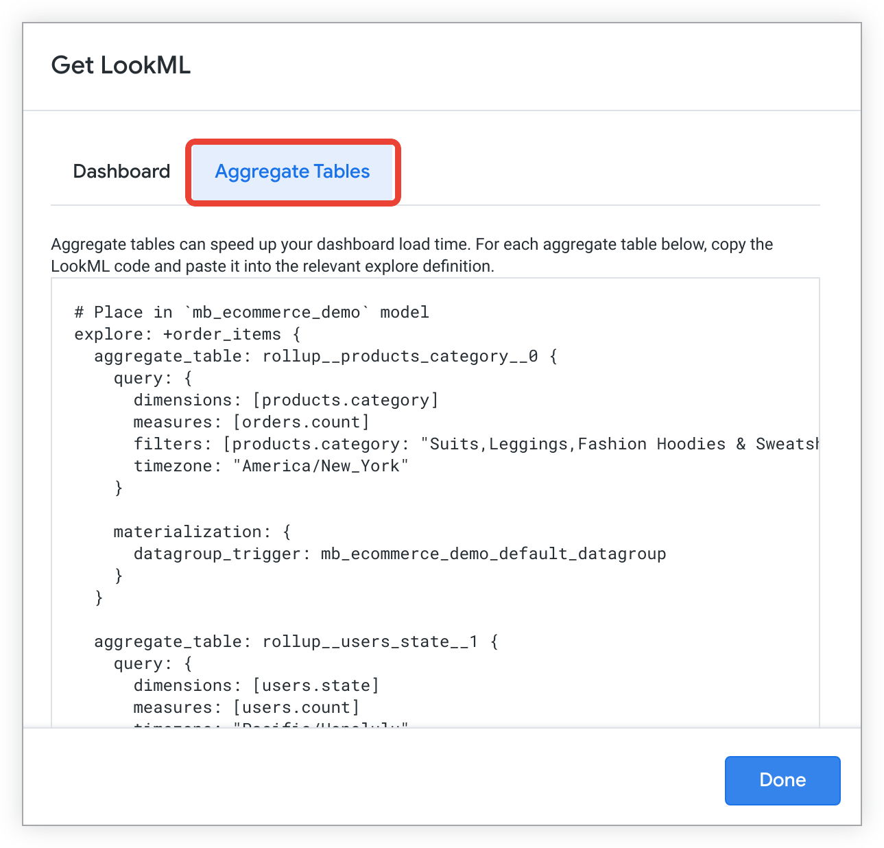 To learn more about how to use the aggregate table LookML that is generated through the Get LookML option, see the aggregate_table parameter documentation page.