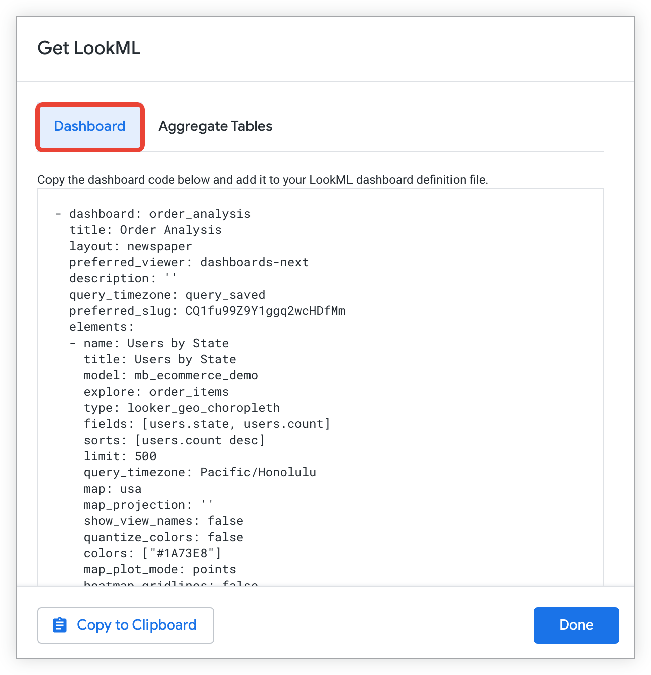 You can then select Copy to Clipboard to copy the dashboard LookML and use it to create a LookML dashboard.