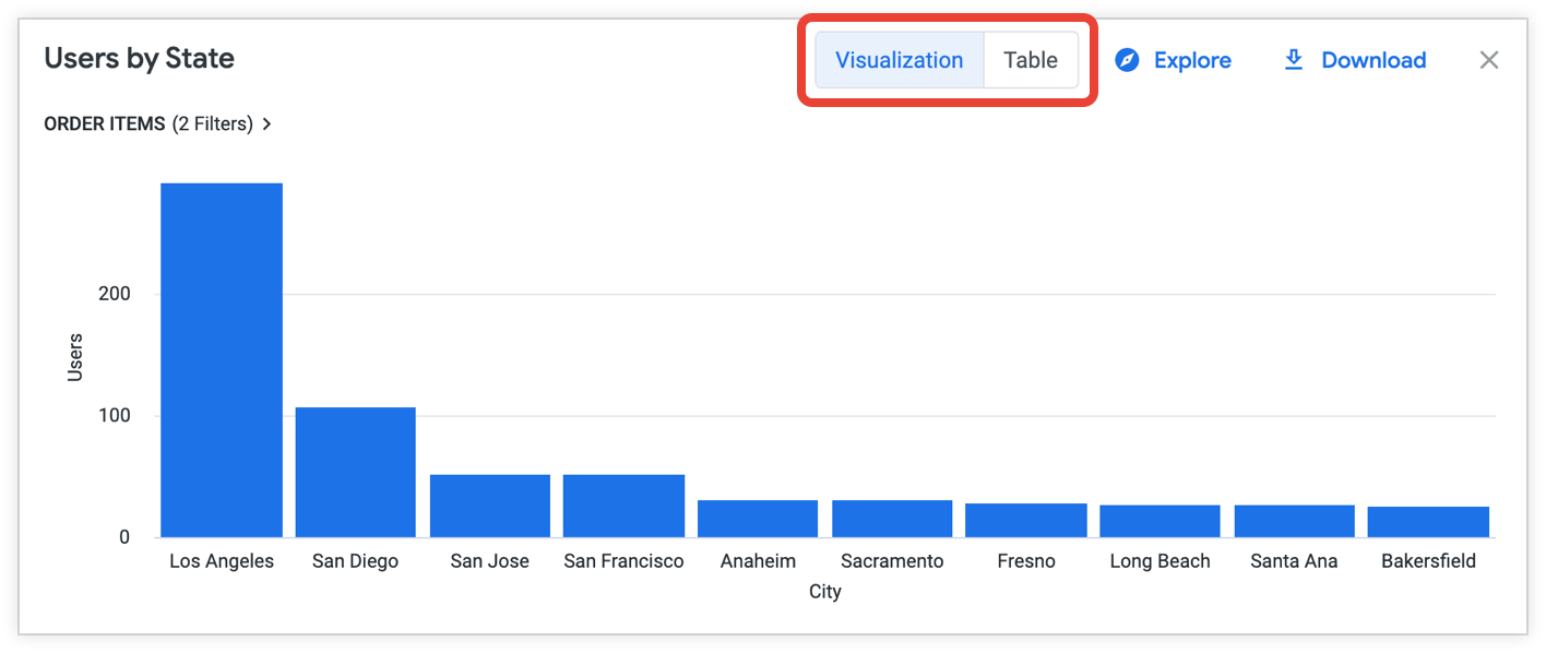If a LookML developer has set up visual drilling for the data you are drilling into, you may see a visualization instead of a data table when you choose a drill menu option. Switch between the visualization and the data table by clicking the Visualization and Table buttons at the top of the drill window:
