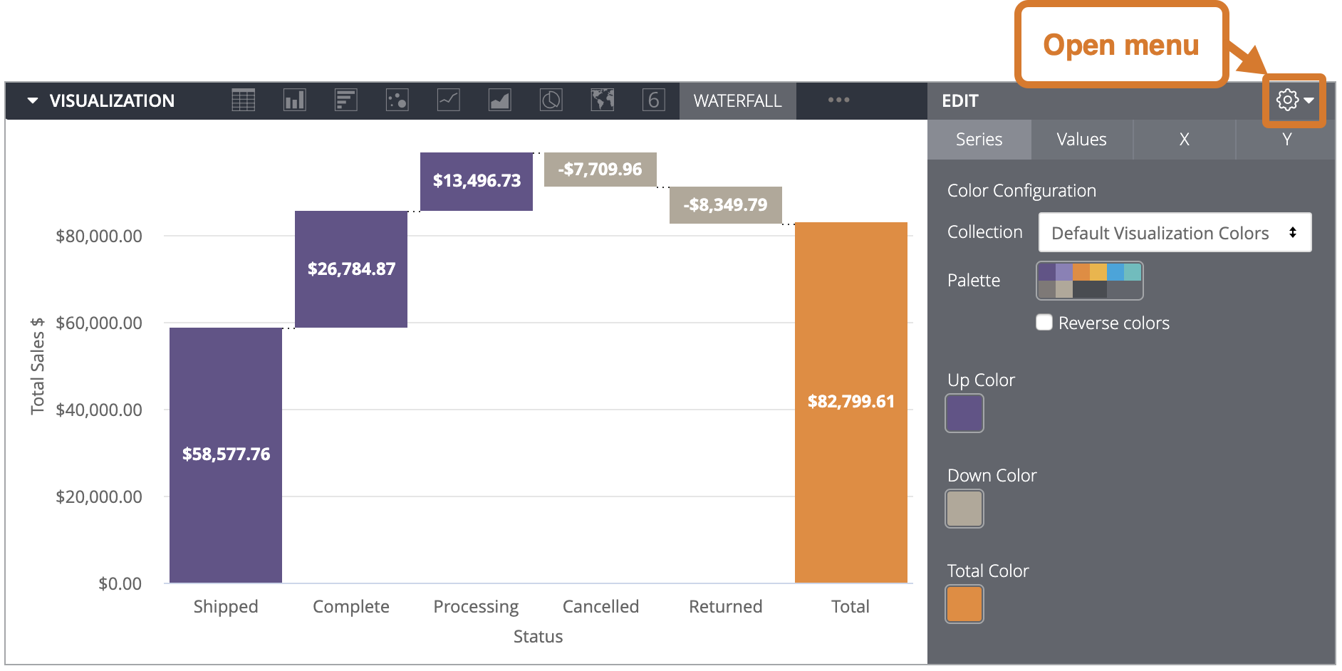 Select Reverse colors to reverse the palette. For a categorical palette, this applies the last three colors in the palette to the Up Color, Down Color, and Total Color. For a sequential or diverging palette, this applies the color at the right end of the palette to the Up Color and move left on the palette for the Down Color and Total Color.