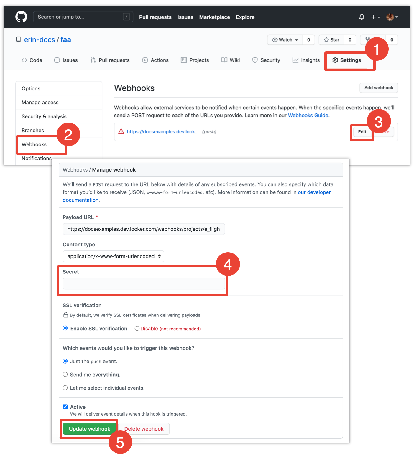 For projects with Git pull request integration, if you have added a deploy webhook secret to your LookML project, you need to go to your Git provider's interface to add the secret to the webhook for your repository. As an example, here is how you do that using GitHub: