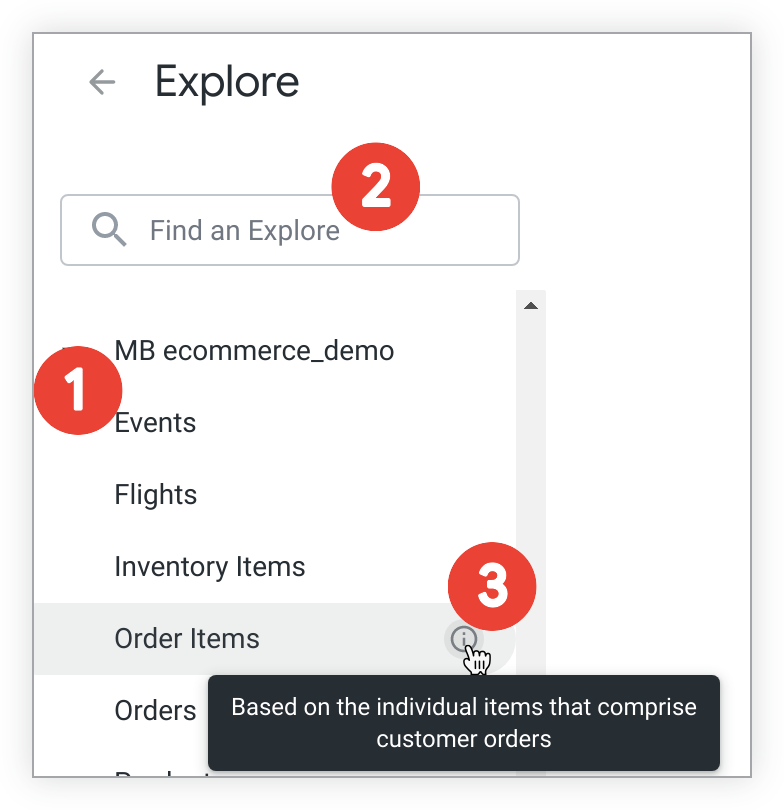 Developers can define descriptions for Explores, which users can view by hovering over the Explore name in the Explore menu.