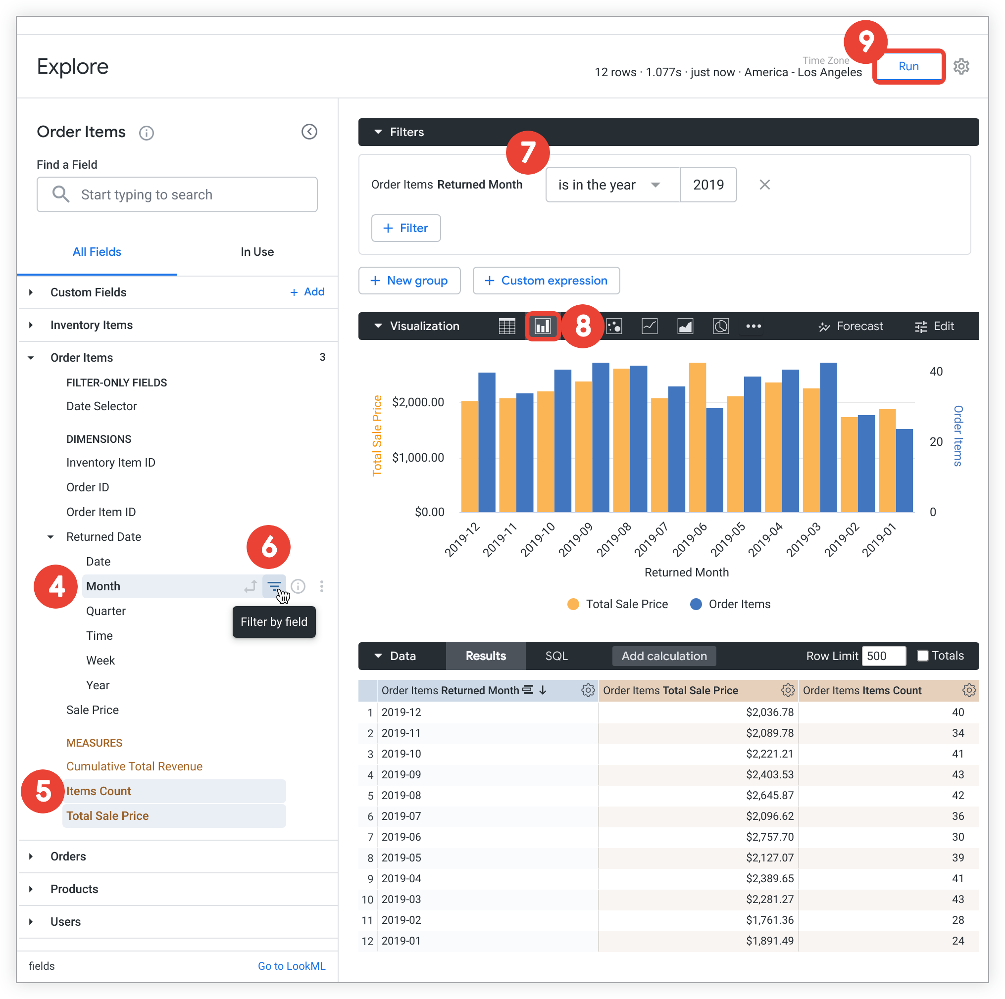 Running this Explore generates a SQL query that returns both a data table and a visualization of the total sale price and total gross margin of the returned orders from the past year.