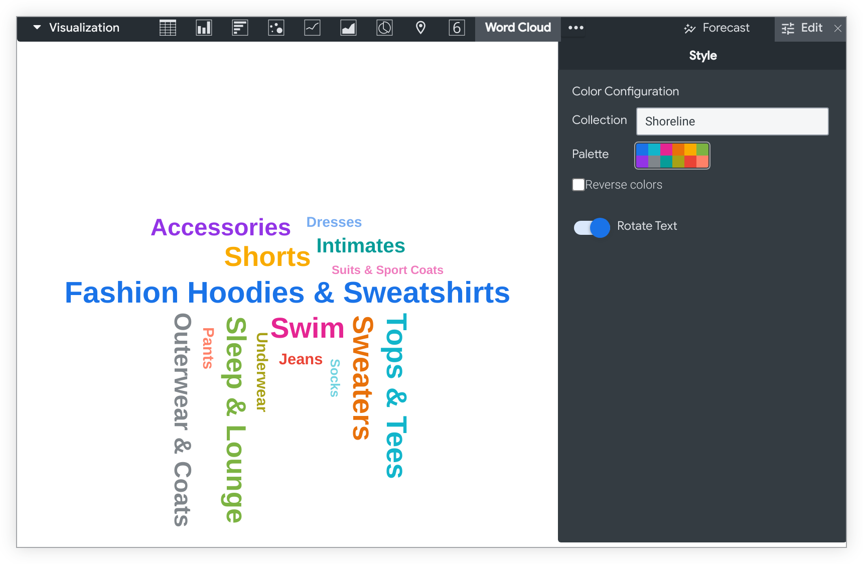 The Fashion Hoodies & Sweatshirts category is the most popular value; it is assigned the first color in the palette and displays with a larger font size than the other values in the chart. The Tops & Tees and Swim categories are the second and third most popular categories; they take on the second and third colors in the palette and display with larger font sizes than less popular values.