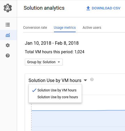 You can view your product's usage by VM hours and core hours. Each metric is aggregated for a 24-hour period. For example, if you have 48 VM hours on a given day, that means an average of 2 VMs were running your product during that day. Similarly, if you have 144 core hours on a given day, there might have been 10 customers running g1-small VMs (0.6 cores each), or one customer running a 6-core custom VM.