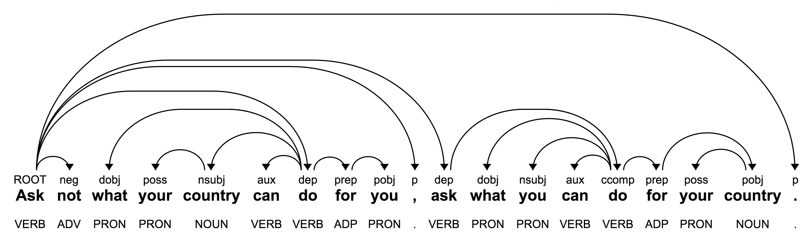 A diagram of the dependency tree for this single sentence from John F. Kennedy's Inaugural speech appears below: