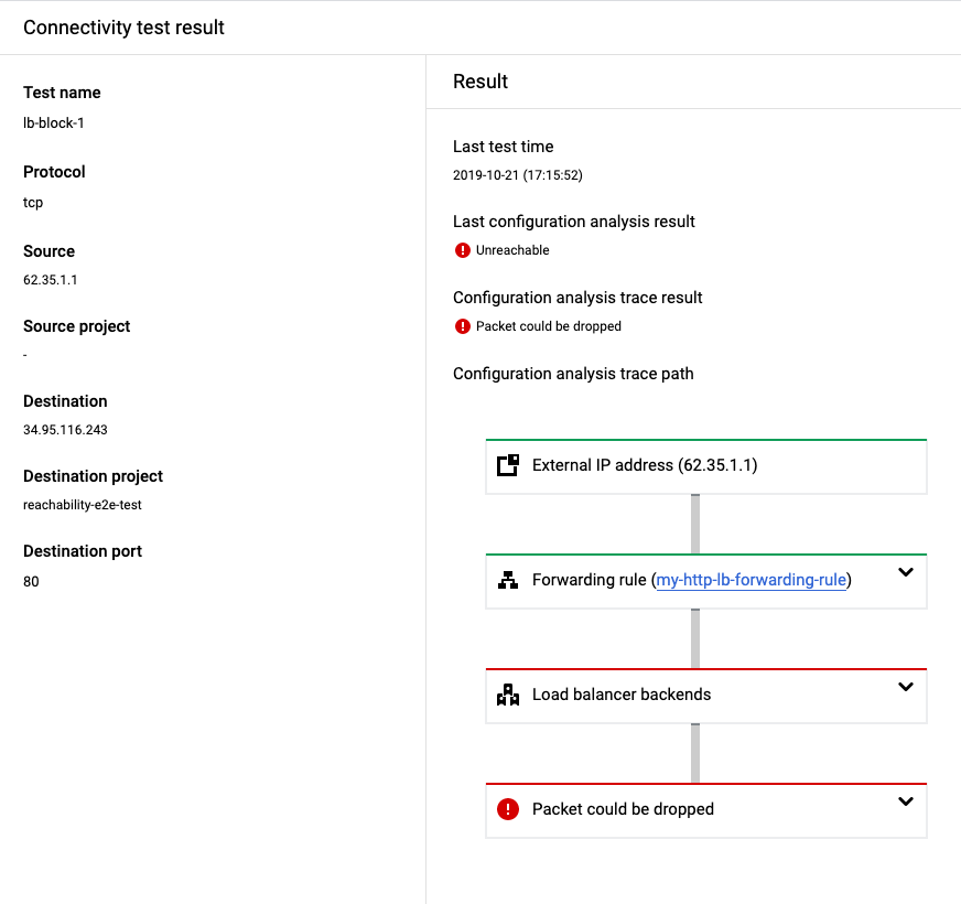 In the following example, Connectivity Tests traces a simulated packet from an external host to a virtual IP address (VIP) for an external Application Load Balancer. The TCP connection from the external host terminates at the proxy for the external Application Load Balancer. The external Application Load Balancer then initiates a new TCP connection to a VM acting as a load balancer backend.