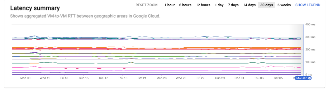 Hold the pointer over the region or zone pair that you want to validate. You can see the value of latency or packet loss for your project and the value of the Google Cloud average for the same pair underneath. If they are similar, it indicates that the performance observed in your projects is similar to the average across all projects within the same region or zone pair.