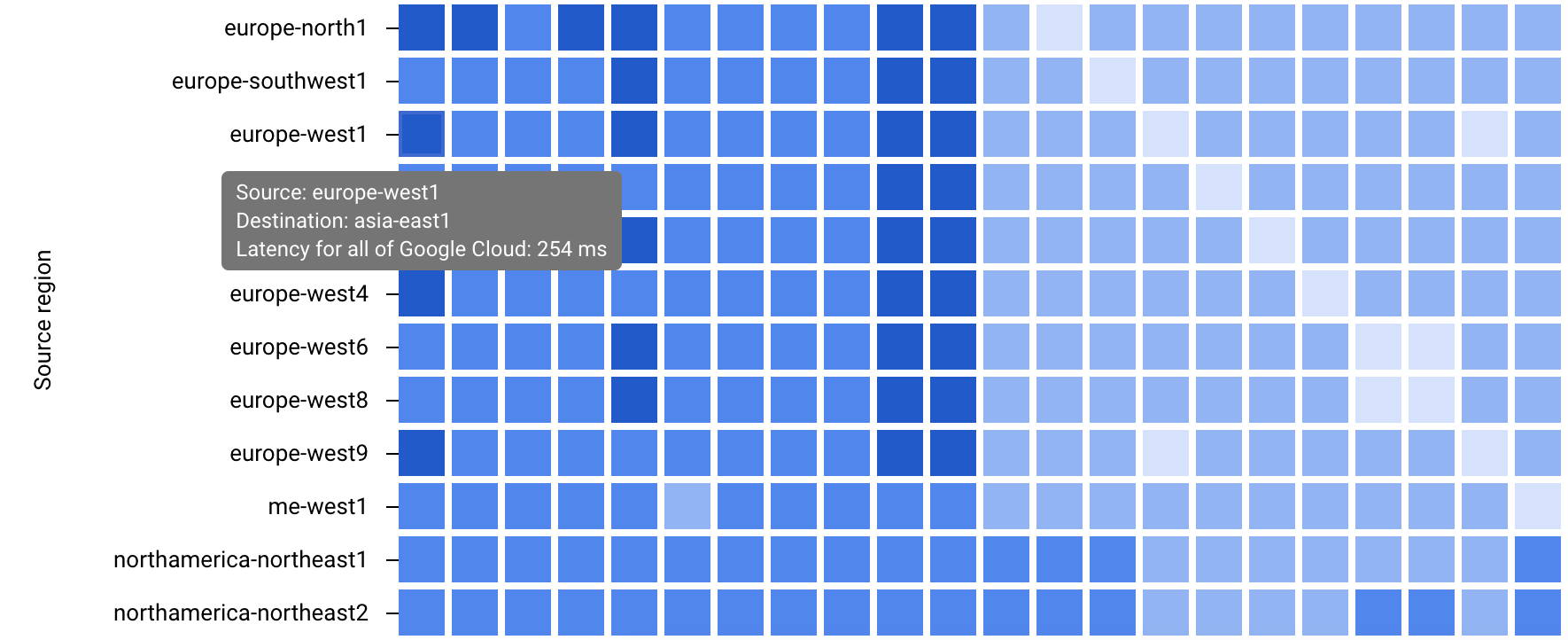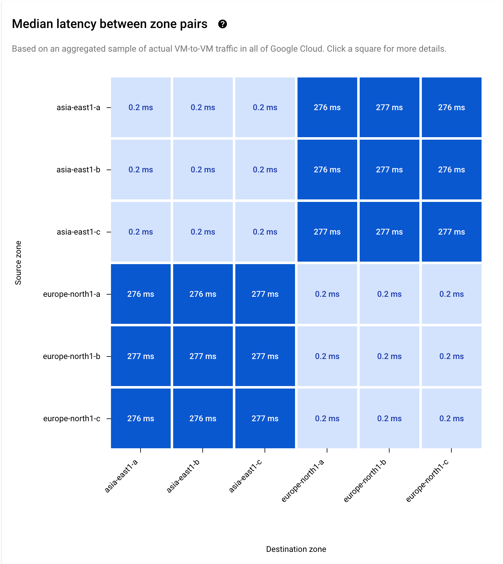To view zone-to-zone data for a region pair, you click the square in the regional heatmap that corresponds to the region pair.