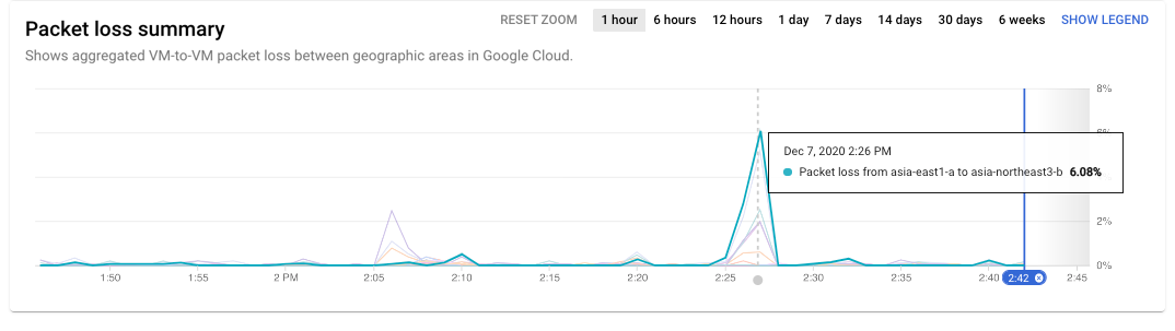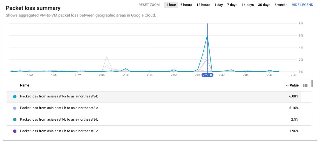 the peak loss occurred between asia-east1-a and asia-northeast3-b at 2:26 PM.