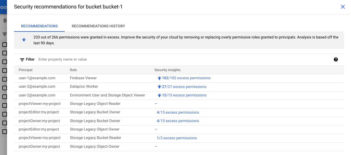 If there are recommendations to review, click a policy insight summary to open the Security recommendations pane. This pane lists all principals who have a role on the bucket, their roles, and any policy insights associated with those roles.