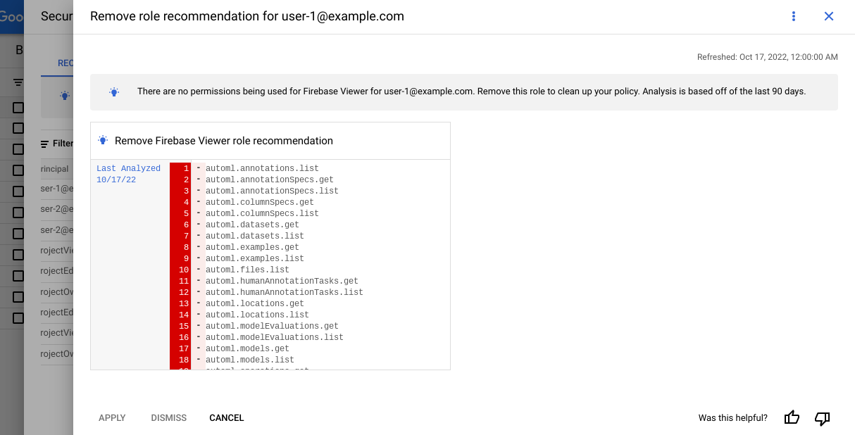 Review each recommendation carefully and consider when it was last refreshed and how it will change the principal's access to Google Cloud resources. To learn how to review recommendations from the REST API, see Review recommendations on this page.