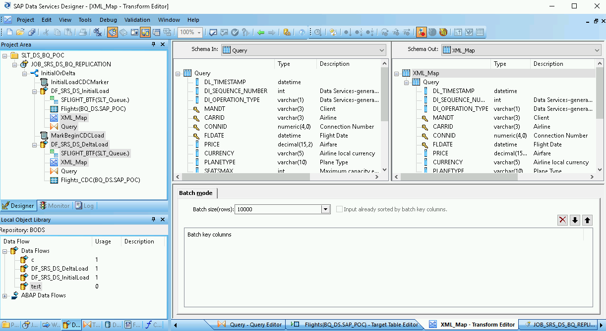 - From the datastore in the object library, drag the imported BigQuery table for the delta load onto the data flow workspace after the XML_Map transform. These instructions use the example datastore name BQ_DS. Your datastore name might be different.