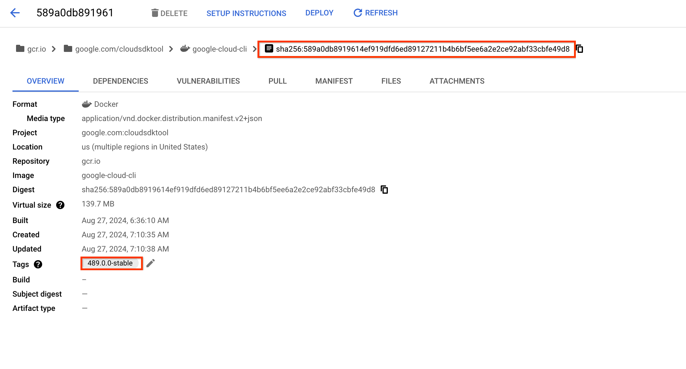 :489.0.0-stable) using the image hash, run the following command:docker pull gcr.io/google.com/cloudsdktool/google-cloud-cli@sha256:589a0db8919614ef919dfd6ed89127211b4b6bf5ee6a2e2ce92abf33cbfe49d8Verify the installation by running: