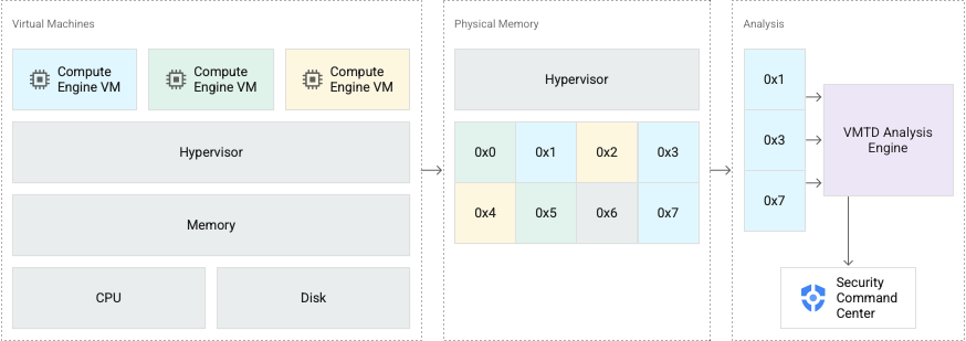 Contents of the VM memory and disk clones are used as inputs in the VM Threat Detection risk analysis pipeline. The data is encrypted in transit and processed by automated systems. During processing, data is safeguarded by Google Cloud's security control systems.