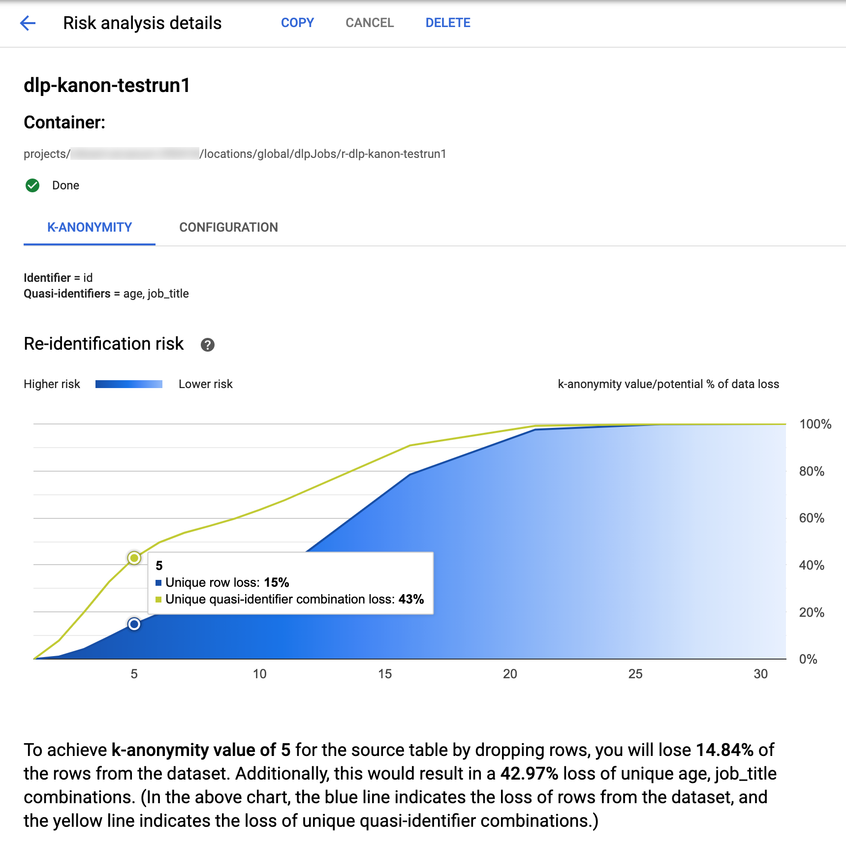 At the top of the page is information about the k-anonymity risk job, including its job ID and, under Container, its resource location.