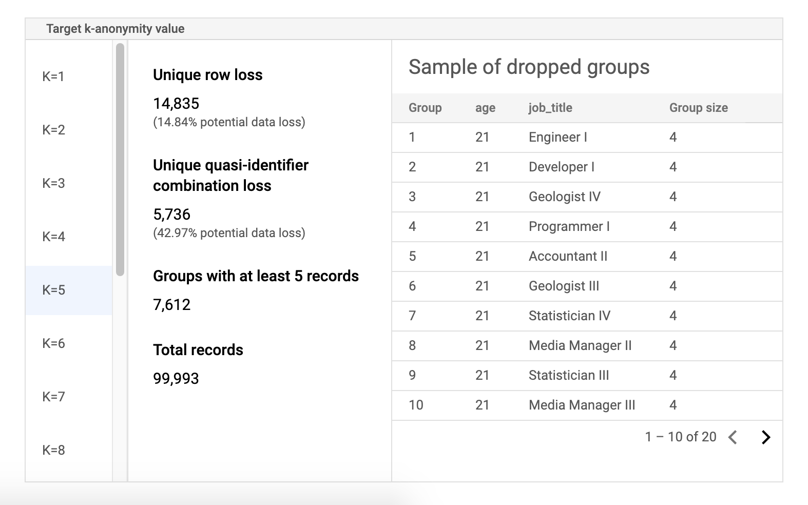 The first column of the table lists the k-anonymity values. Click a k-anonymity value to view corresponding sample data that would need to be dropped to achieve that value.
