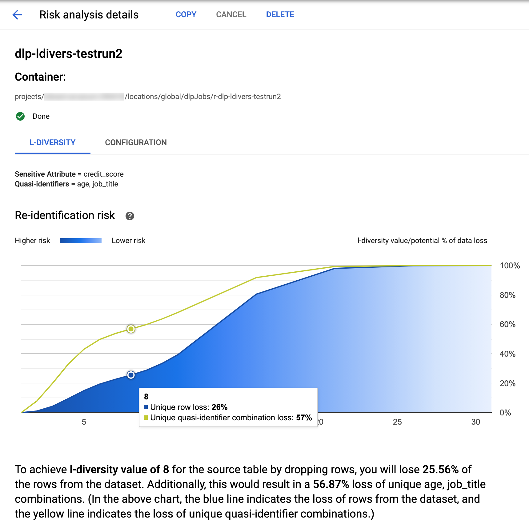 At the top of the page is information about the l-diversity risk job, including its job ID and, under Container, its resource location.