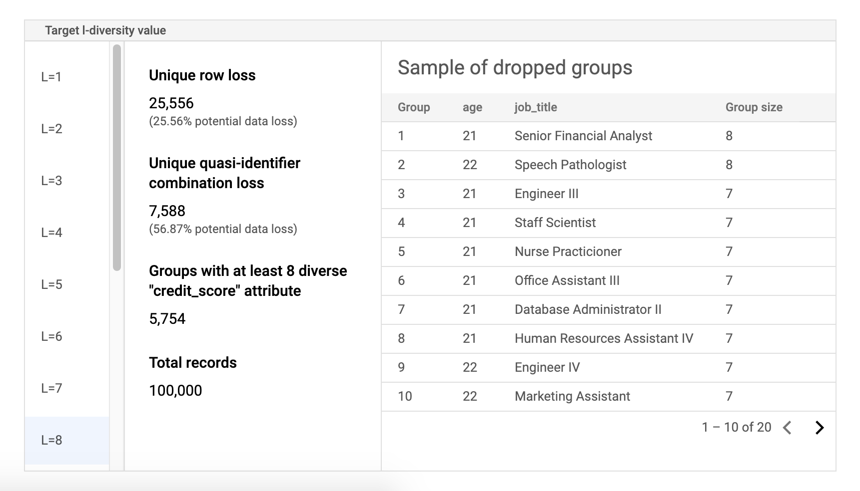 The first column of the table lists the k-anonymity values. Click an l-diversity value to view corresponding sample data that would need to be dropped to achieve that value.
