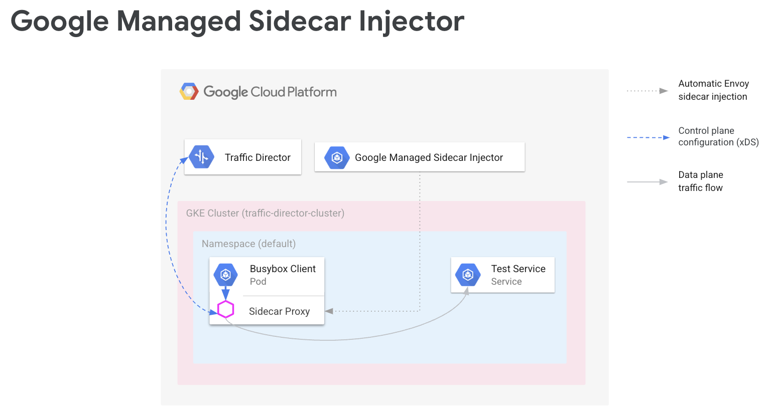 The Google managed Envoy sidecar injector adds Envoy sidecar proxies to your Google Kubernetes Engine Pods. When the Envoy sidecar injector adds a proxy, it also sets that proxy up to handle application traffic and connect to Cloud Service Mesh for configuration.