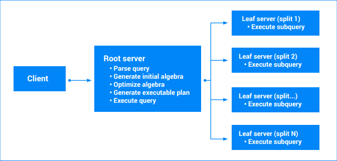 Queries that involve multiple splits will be factored into multiple pieces. Some part of the query will continue to be executed on the main (root) server. Other partial subqueries are handed-off to leaf nodes (those that own the splits being read). This hand-off can be recursively applied for complex queries, resulting in a tree of server executions. All servers agree on a timestamp so that the query results are a consistent snapshot of the data. Each leaf server sends back a stream of partial results. For queries involving aggregation, these could be partially-aggregated results. The query root server processes results from the leaf servers and runs the remainder of the query plan. For more information, see Query execution plans.