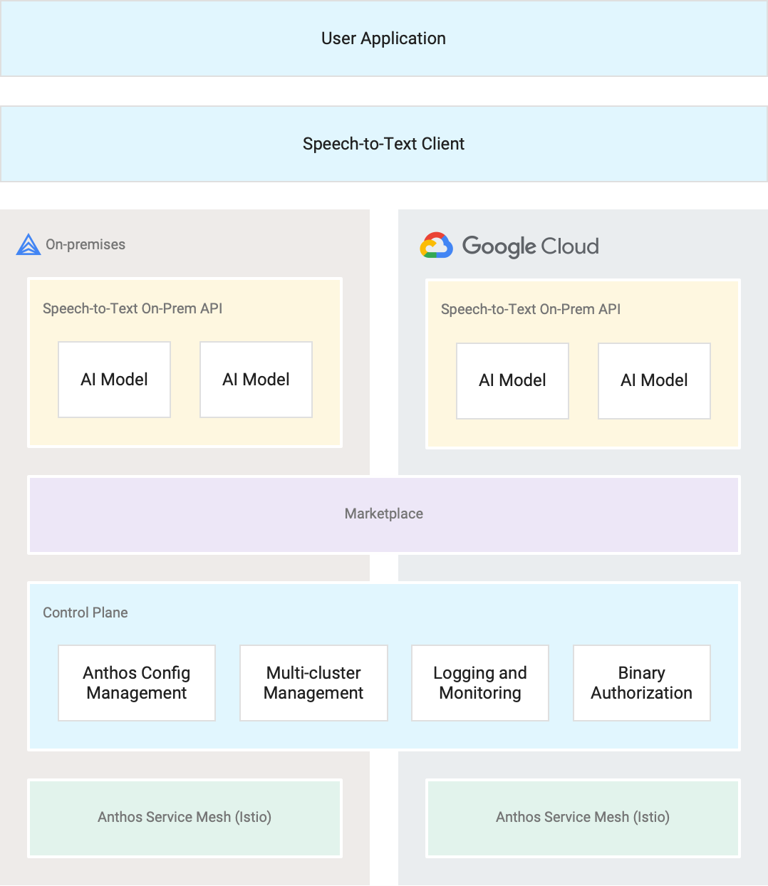Speech-to-Text On-Prem is a Google Cloud Marketplace application and can be deployed as a container to any GKE cluster. This gives you flexibility and greater control in deployment, whether you decide to deploy on Google Cloud with GKE or on-premises with Anthos. This lets you to take advantage of the simplicity, agility, and cost-effectiveness of Google's container hosting and management across hybrid environments.