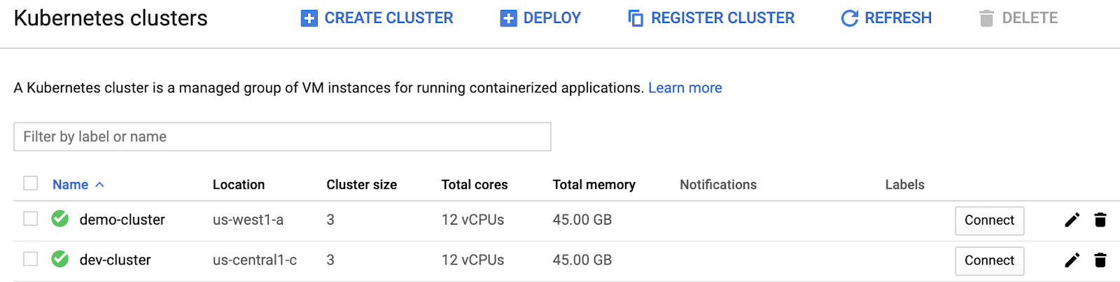 Make sure that you are running either a GKE or Anthos cluster. Kubernetes clusters are available on Google Cloud Platform. If you have pre-existing clusters, you can choose one from the list that appears by checking the box at the far left of the cluster's name:
