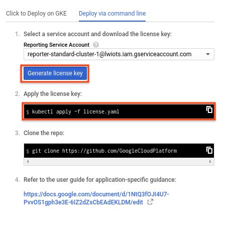 kubectl apply -f "https://raw.githubusercontent.com/GoogleCloudPlatform/marketplace-k8s-app-tools/master/crd/app-crd.yaml"Create a reporting secret. This value is used by the application to report usage back to Google, and is used for future billing. On the solution page, under "Deploy via command line" tab, follow only instructions 1 & 2 to generate & deploy the license reporting secret.