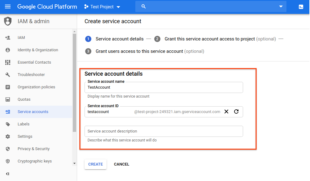 If your project does not yet have any service accounts, you are prompted to create one. Type a name of your choosing into the Service account name box. Your input is automatically populated in the Service account ID box. The Service account description box is optional but recommended if you plan on associating multiple service accounts with your project. Enter a brief description of the service account into this box, then click CREATE.