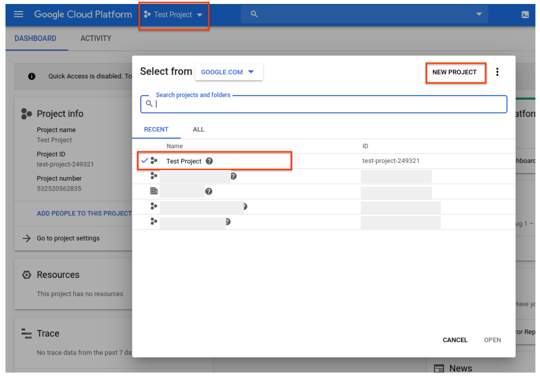 1. Go to the GCP Console. Navigate to the drop-down menu at the top of the page and choose the GCP project that you'd like to associate with Cloud Talent Solution. If you have previously created one or more projects, they will appear in a list in the pop-up menu. You can either choose a pre-existing project (a check mark will appear next to the project you select) or create a new project by clicking NEW PROJECT. For more details on creating a GCP project, please see the documentation.