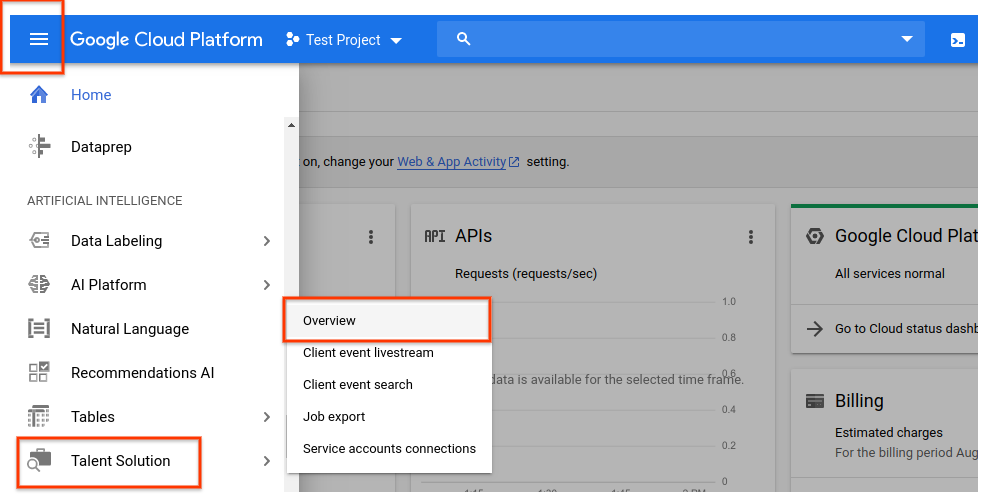 3. Once you have selected a GCP project and linked it to a billing account, you can enable the Cloud Talent Solution API. Go to the main navigation menu and scroll down to the Artificial Intelligence section. Click on Talent Solution and choose Overview from the menu that pops up: