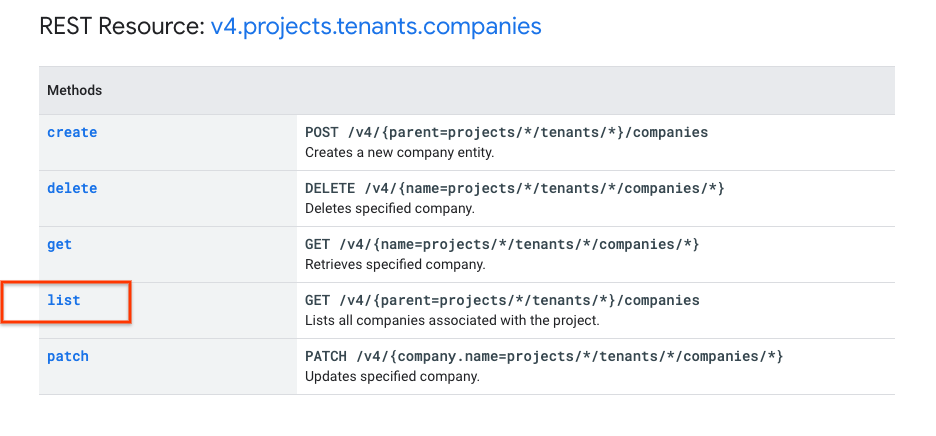 Choose the method you want to call. This demonstration walks you through listing the companies associated with your Google Cloud Platform service account. If you have not yet created any companies, the API will return an empty list. To try out a different method, follow the broader steps outlined below while referring to the reference documentation to guide you through the required data for each API call.