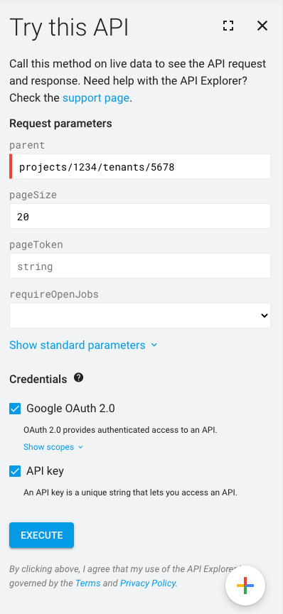 You can use the API Explorer tool to send trial requests to Cloud Talent Solution. The Explorer presents a form that shows the parameters for each method. Fill in the form, execute the API call, and see the results. You must have completed the "GCP Console set-up" section of the Before You Begin page before you can use API Explorer.
