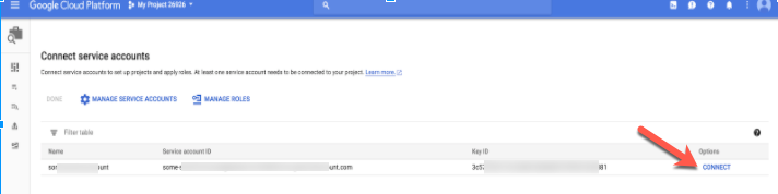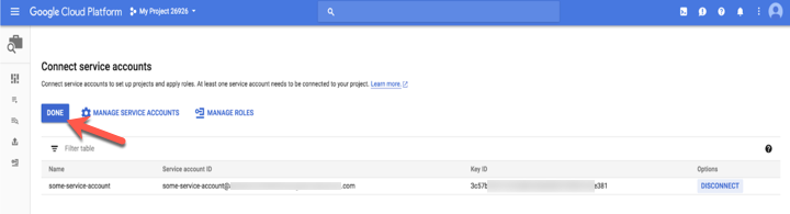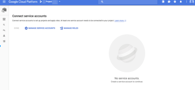 If you already have service accounts created for your Google Cloud project, you'll see a list of them here, otherwise, click MANAGE SERVICE ACCOUNTS. See Creating a service account for instructions.
