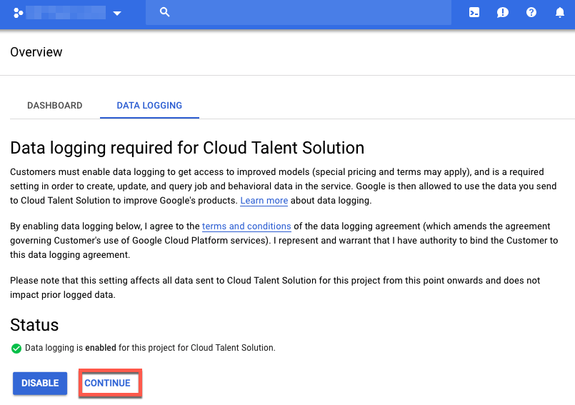 The data logging opt-in page appears. Accepting the terms outlined on this page allows you to use the various API features. By not accepting these terms, you'll only be able to use deletion API requests.