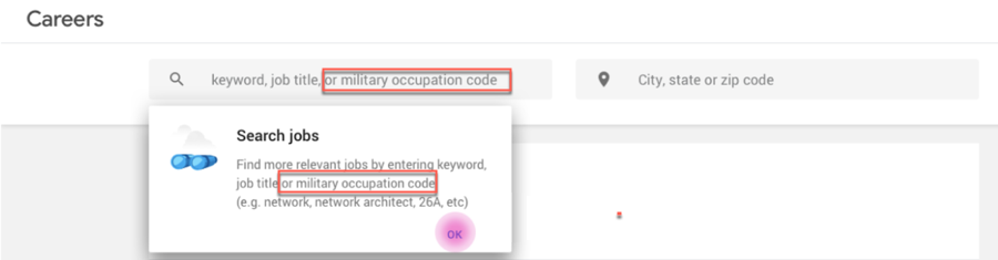 Because this technology is still new, we recommended that you incorporate an element into your UI that makes job seekers aware of this feature. For example, you can call out "military occupation code" in the search box and drop down:
