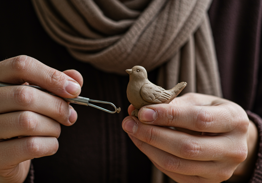 - A view of a person's hand as they hold a little clay figurine of a bird in their hand and sculpt it with a modeling tool in their other hand. You can see the sculptor's scarf. Their hands are covered in clay dust. A macro DSLR image highlighting the texture and craftsmanship.
