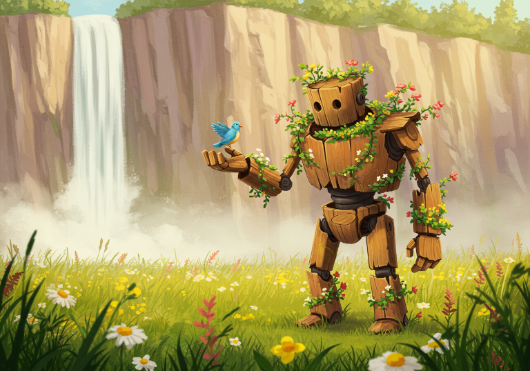 - A weathered, wooden mech robot covered in flowering vines stands peacefully in a field of tall wildflowers, with a a small blue bird resting on its outstrecteched hand. Digital Cartoon, with warm colors and soft lines. A large cliff with a waterfall looms behind.