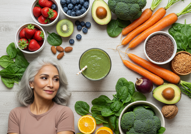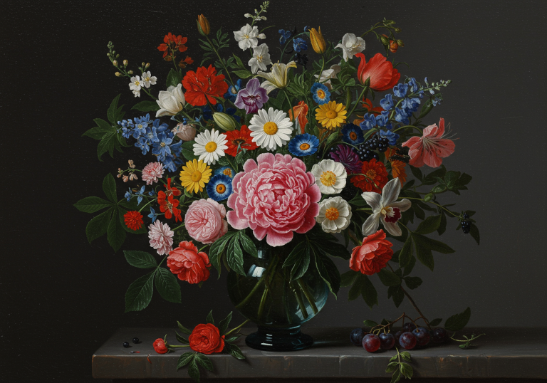 - A large, colorful bouquet of flowers in an old blue glass vase on the table. In front is one beautiful peony flower surrounded by various other blossoms like roses, lilies, daisies, orchids, fruits, berries, green leaves. The background is dark gray. Oil painting in the style of the Dutch Golden Age.