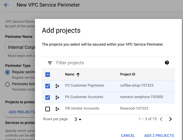 In the Add Projects pane, select the projects that you want to add to the perimeter and then click Add selected projects.
