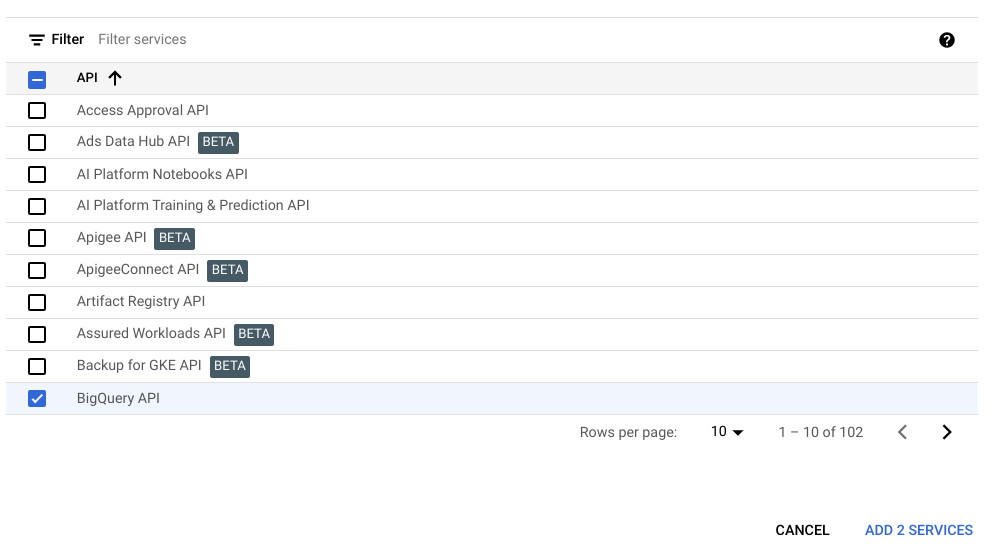 In the Add services pane, select the checkboxes for the BigQuery and Cloud Storage APIs.