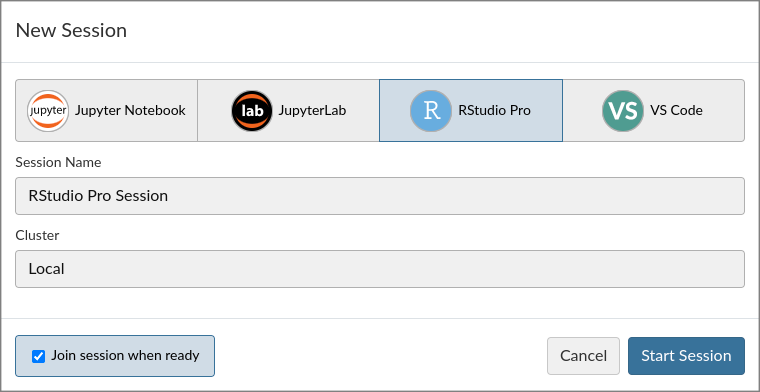 Select RStudio Pro as the IDE and leave Cluster set to Local.