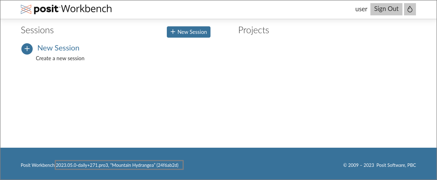 The following example shows the welcome page for the Posit Workbench. Your page might look different, depending on how your organization defines your workstation configuration: